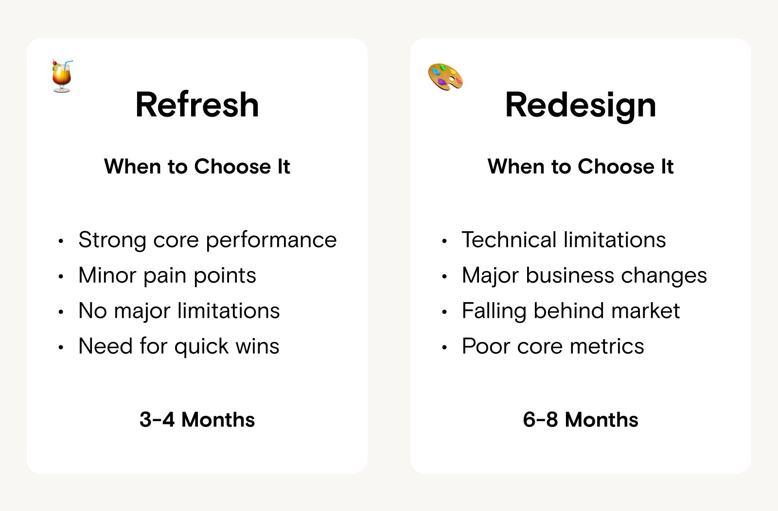 - If choosing a refresh, focus on quick wins like visual updates and small UX improvements.