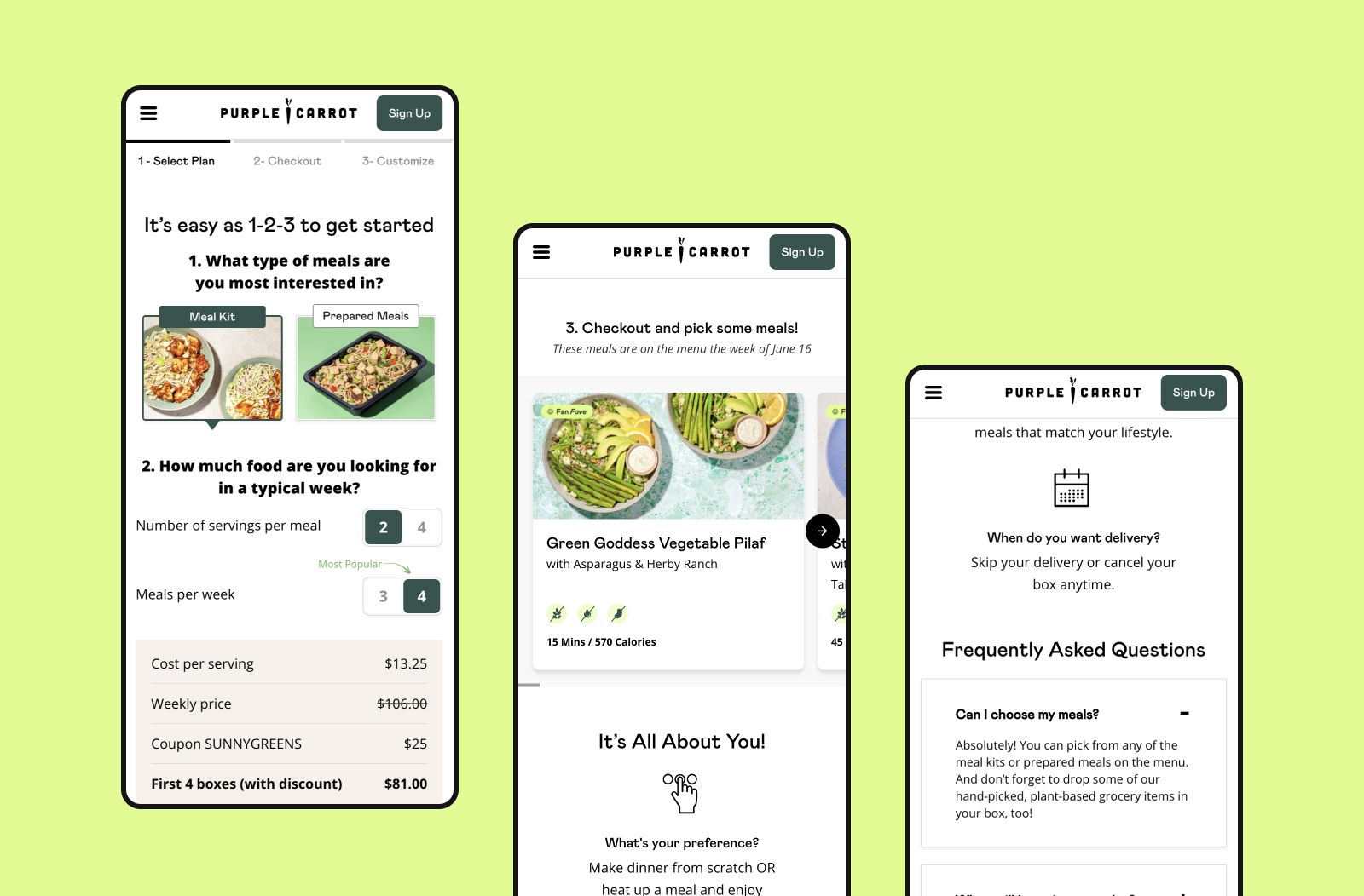 For example, Purple Carrot uses its Pricing page to guide aspiring home chefs through its plant-based meal delivery service. This page helps customers complete the purchase by clearly outlining the high-quality nature of their product, per-meal pricing, and delivery and subscription management options. (But it could still be improved by adding some social proof!)