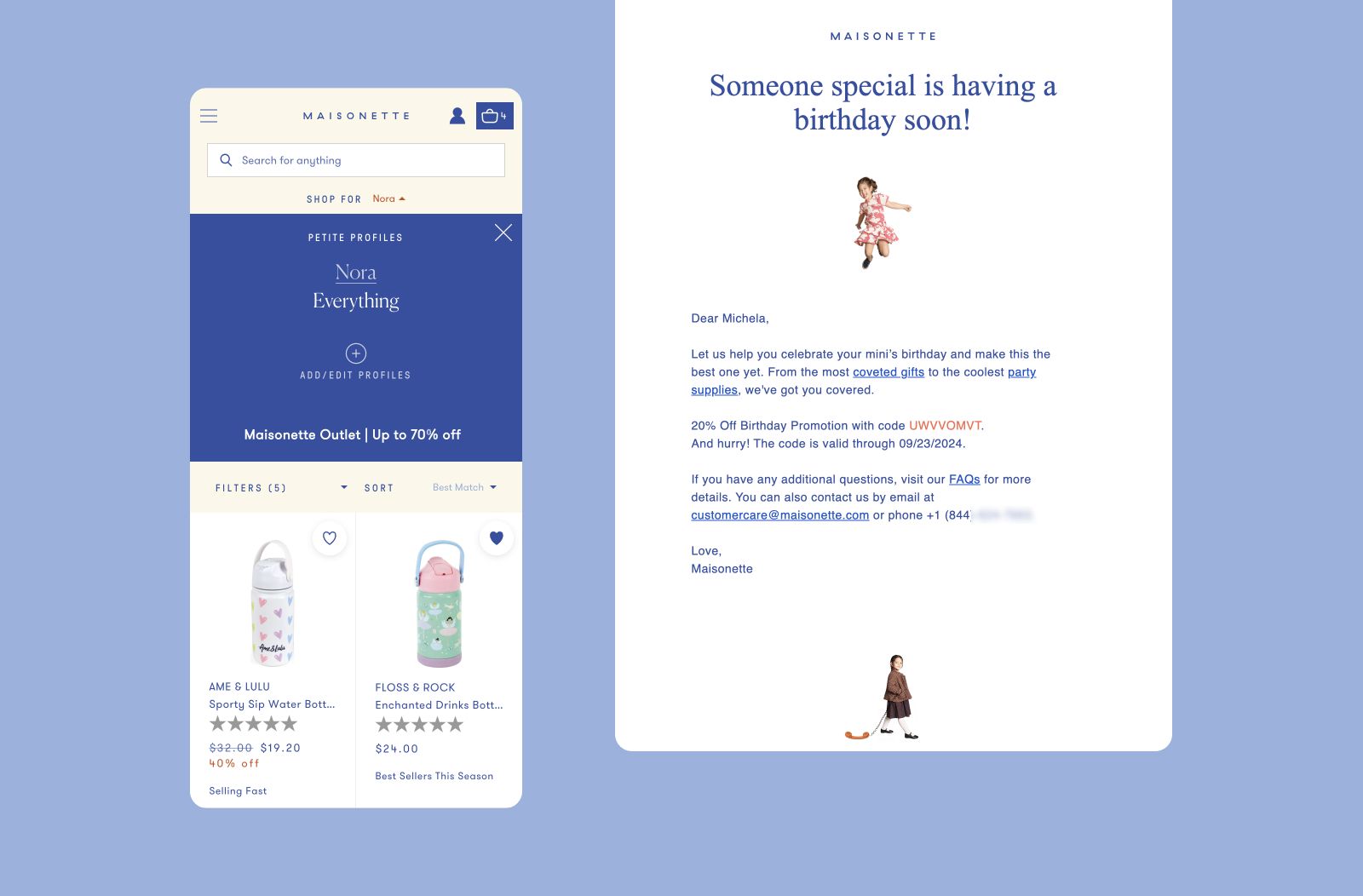 Maisonette offers a great example of effective personalization features. Users with an account can save multiple profiles with details like name, date of birth, and gender. Maisonette then provides selections based on these data, and users receive a notification one month before the recipient's birthday with a special promotional code. Such personalization can lead to higher conversion rates, increased customer retention, and greater overall success in the competitive DTC market.