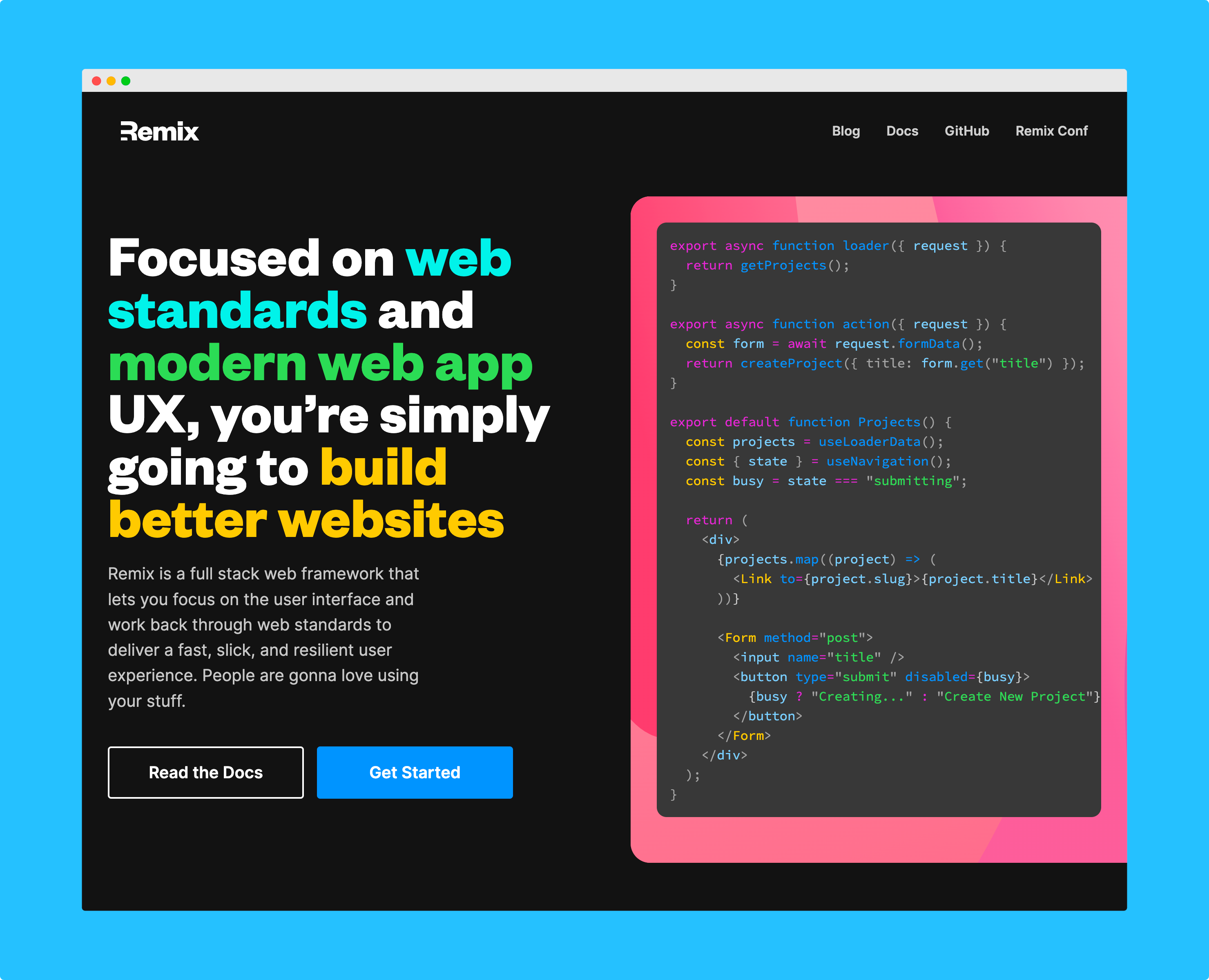 For those unfamiliar with it, Remix is an up-and-coming Javascript framework based on React. It was developed by Kent C. Dodds, Ryan Florence, and Michael Jackson, all well-known contributors to the Javascript open-source community.