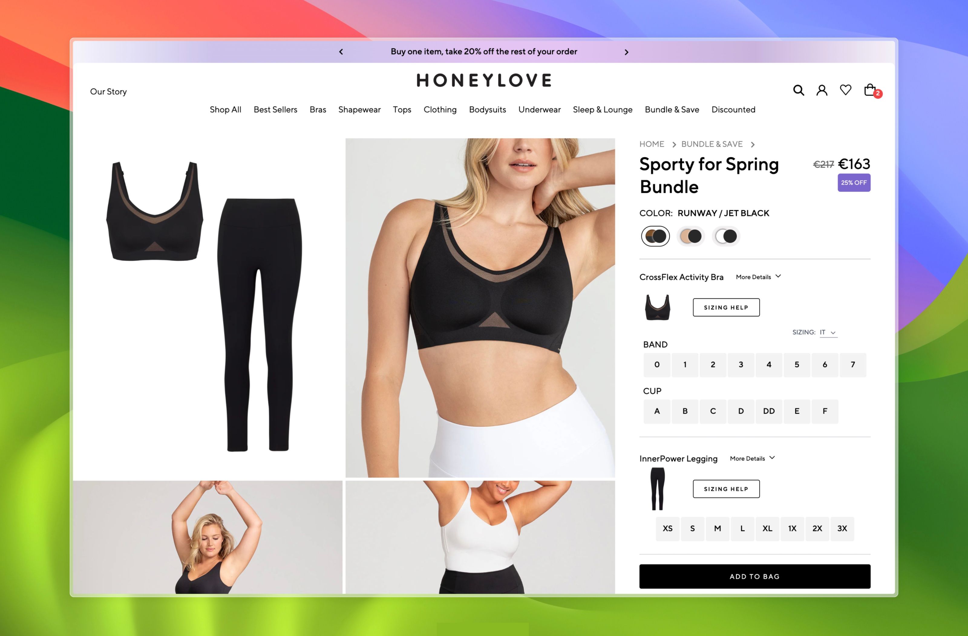 For example, HoneyLove sells women's underwear, providing a sophisticated shopping experience that allows customers to select different sizes for tops and bottoms without navigating between product pages, streamlining the path to checkout.