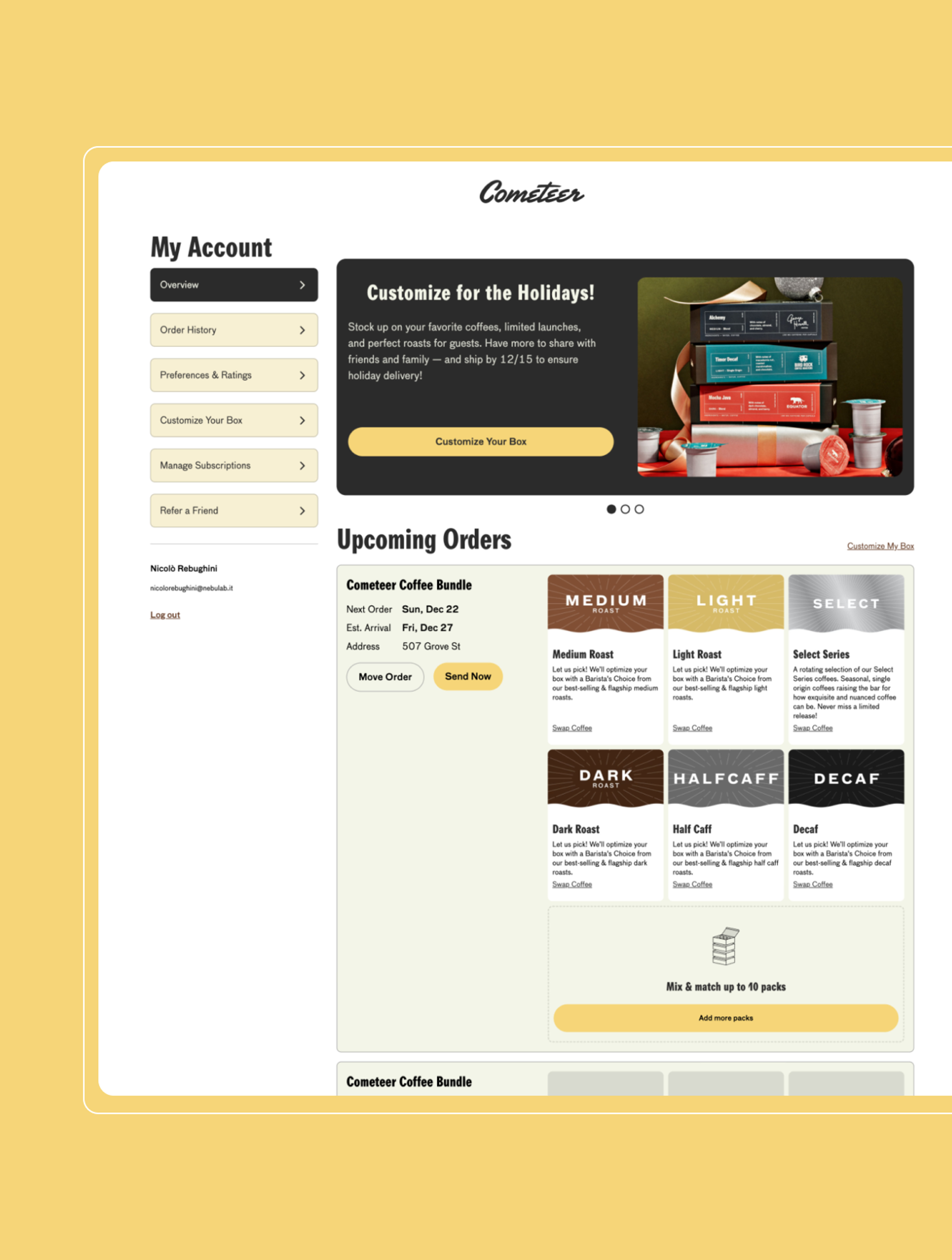 As their subscriber base expanded and business model evolved, Cometeer faced increasing complexity in their technology stack. They needed a solution that could handle sophisticated subscription logic, enable product customization, and provide a seamless customer experience—all while optimizing operations and inventory management. The company turned to Nebulab to build a scalable platform that could support their vision for the future of coffee.